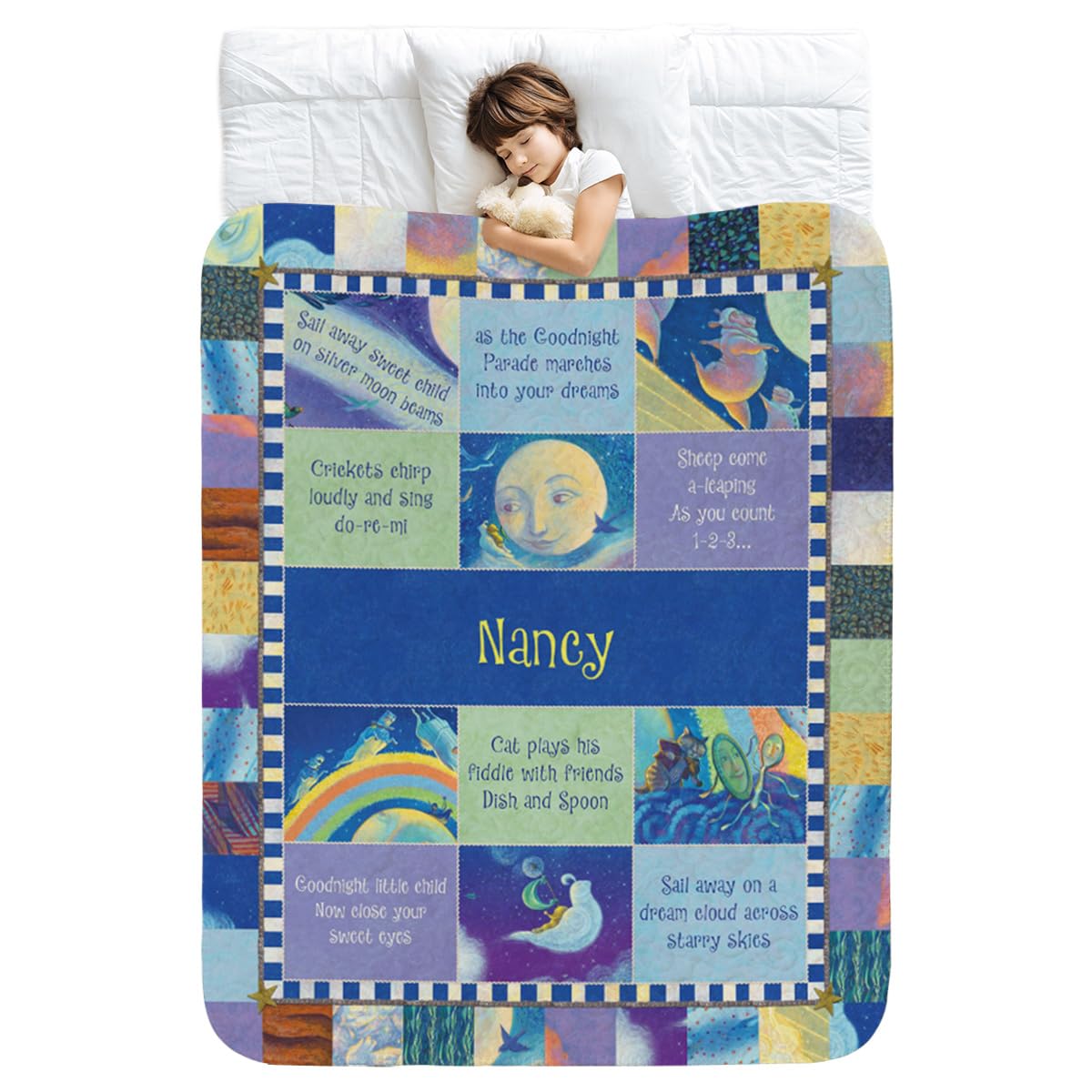 PERSONALIZED STORY BLANKET – Featuring the child’s name, birthday, and hometown, this personalized blankie displays a bedtime story from our bestselling book “Goodnight Little Me.”
