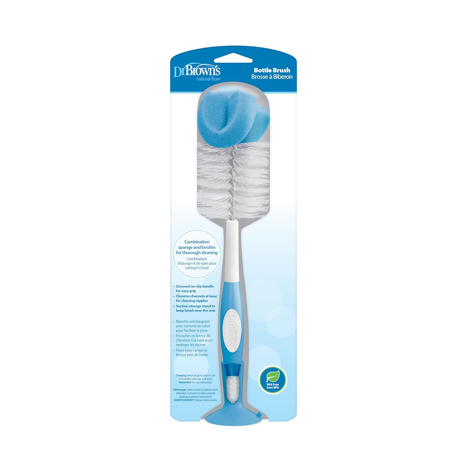 Dr. Brown’s Reusable Sponge Baby Bottle Cleaning Brush with Suction Cup Stand, Scrubber and Nipple Cleaner, Blue 1-Pack