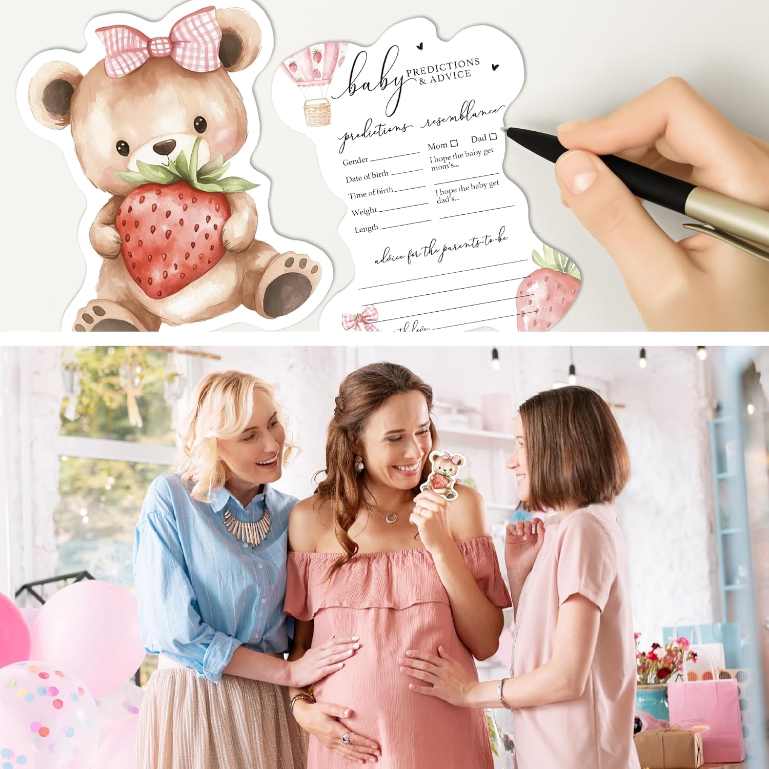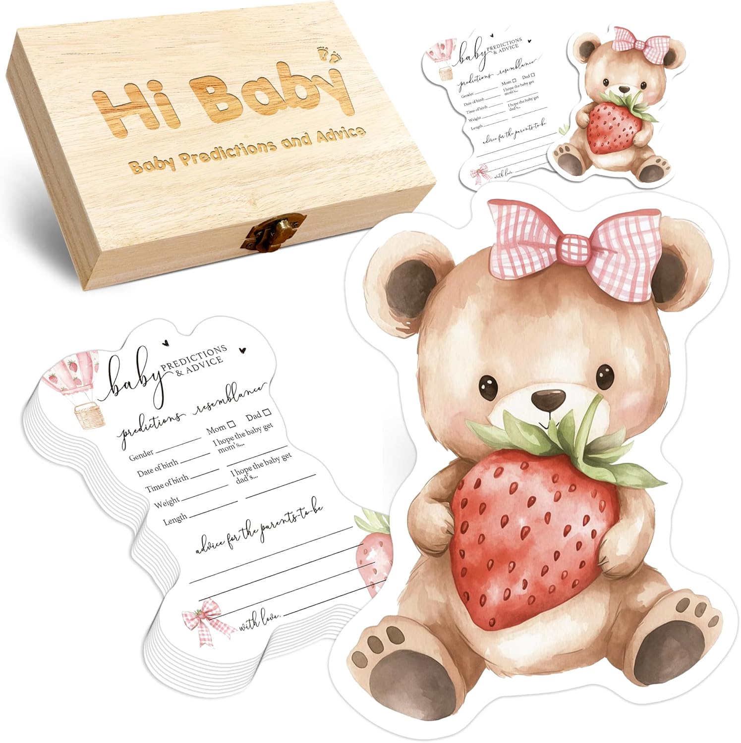 50 Pcs Strawberry Bear Baby Prediction Cards with Wooden Keepsake Box – Baby Shower Game for Gender Reveal, Parenting Advice & New Parents Wishes – A10