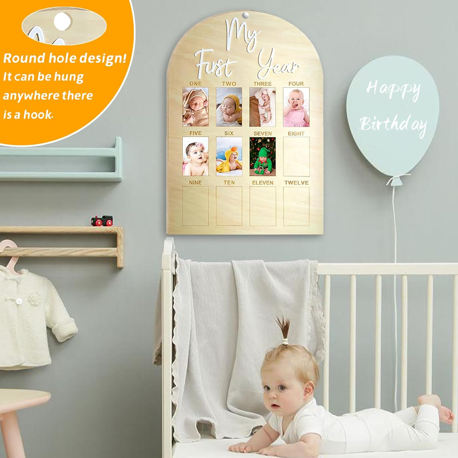 SIZE & MATERIAL: My first year milestone board size 17″ high x 12″ wide, made from 1/5″ thick premium wood,smooth and reusable, Beautiful acrylic sign and engraved pattern, not easy to fade or peel. fits 2″ x 3″ photos (Wallet Size), easy to use.