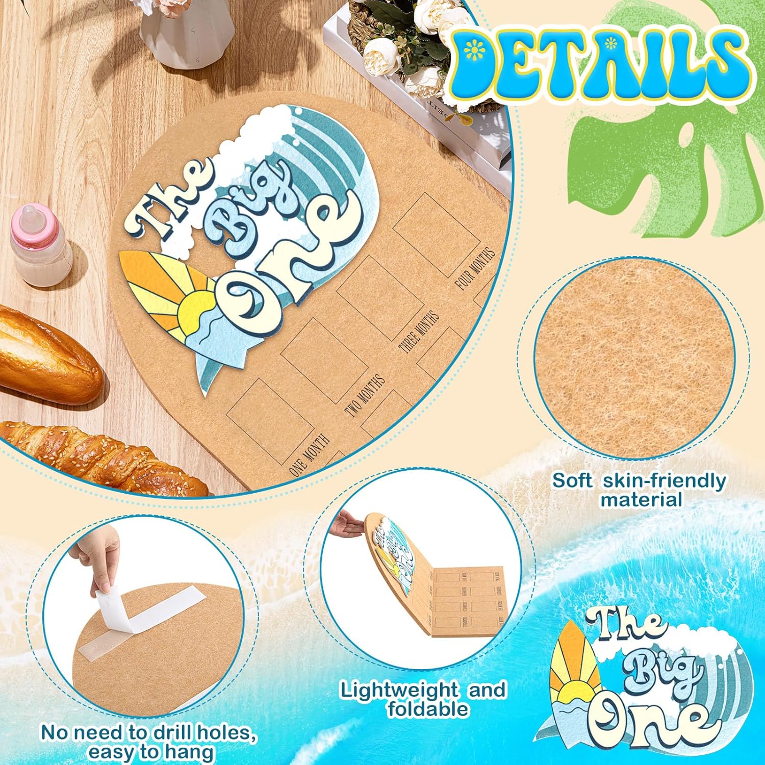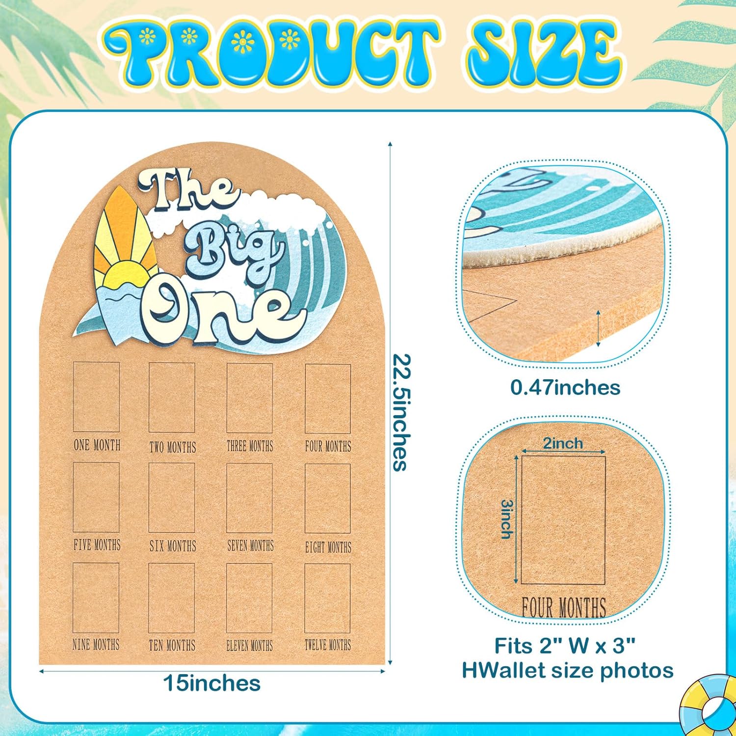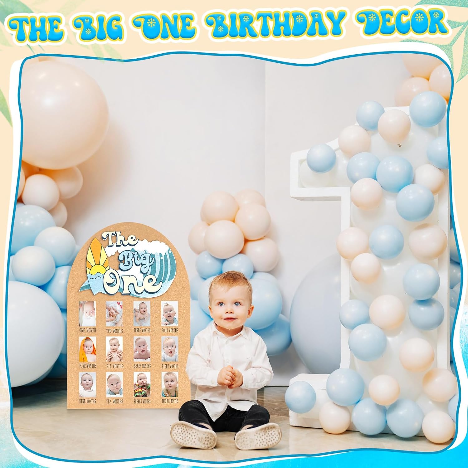 The Big One Surf Theme Photo Board: the surf theme design with bright colors and wave elements injects infinite vitality and creative imagination into your baby’s first birthday celebration; Whether it is displayed at a party or hung at home, it will become a personalized decoration to celebrate your baby’s unique journey from newborn to one year old
