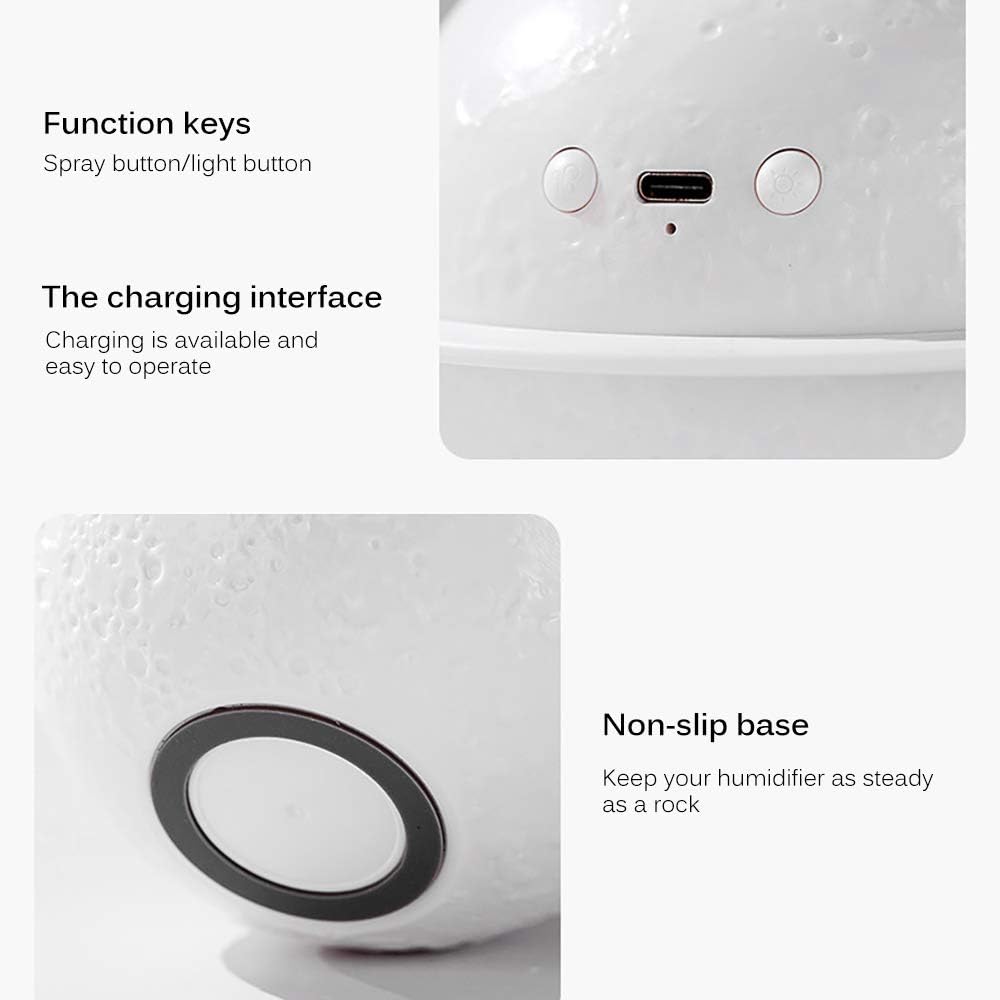 🌛 2 Sensitive Touch Controls Planet Humidifier — Touch the switches to adjust the light and spray. One switch adjusts the color of the light, and the other adjusts the spray frequency of the humidifier. The light has three colors: white, white and yellow, warm yellow. There are two kinds of spray frequency, namely continuous spray and intermittent spray. (Note that the touch method is touch or slide over the switch, not continuous touch)