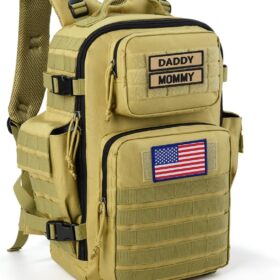 SHARKMOUTH Military Diaper Bag for Dad – Insulated Baby Diaper Backpack with Patches for Hiking Travel Camping – Baby Shower Gifts Tan