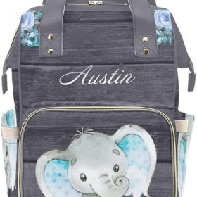 Personalized Cute Blue Elephant Floral Diaper Backpack with Name Text Large Capacity Custom Multi-Function Bag Unisex Travel Backpack for Mom Dad Boy Girl, 10.83 in L x 6.69 in W x 15 in H