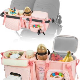 kcross Double Stroller Organizer Bag for Bob Duallie and Baby Jogger City Mini Gt2, Double Stroller Caddy Organizers with Cup Holder,Parent Console Stroller Accessories with Cooler Pockets