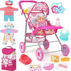 This realistic tandem jogging stroller features two seating spaces with seatbelts and a retractable canopy for dolls and stuffed animals up to 18 inches. A palette of a soft pink with gray polka-dotted washable polyester, stretched over a sturdy cream-colored iron frame. Comfortable to push, the stroller’s trio of wheels […]