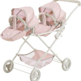Olivia’s Little World Double Jogging-Style Doll Stroller for Baby Dolls with Tandem Seating, Retractable Canopy, Storage Basket, All-Terrain Wheels, Cream, Pink and Gray Polka Dots