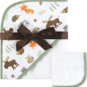 Hudson Baby Unisex Baby Cotton Hooded Towel and Washcloth, Woodland, One Size