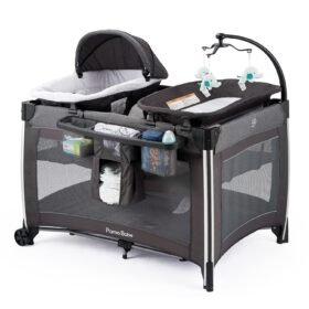 Pamo Babe 4 in 1 Portable Baby Crib Deluxe Nursery Center, Foldable Travel Playard with Bassinet, Mattress, Changing Table for Newborn, Infant, Toddler(Grey)