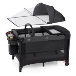 BABY JOY 5-in-1 Pack and Play with Canopy, 4 Adjustable Heights Baby Bedside Sleeper w/Bassinet, U-Shaped Diaper Changer, Safety Strap, Side Zipper, Portable Bedside Playard from Newborn to Toddlers