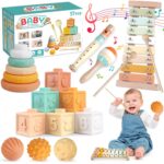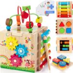Bravmate Wooden Activity Cube, 8-in-1 Wooden Montessori Learning Toys for 18 M+ Toddlers, One Year Old First Birthday Gift, Baby Toy Set with Bonus Sorting & Stacking Board